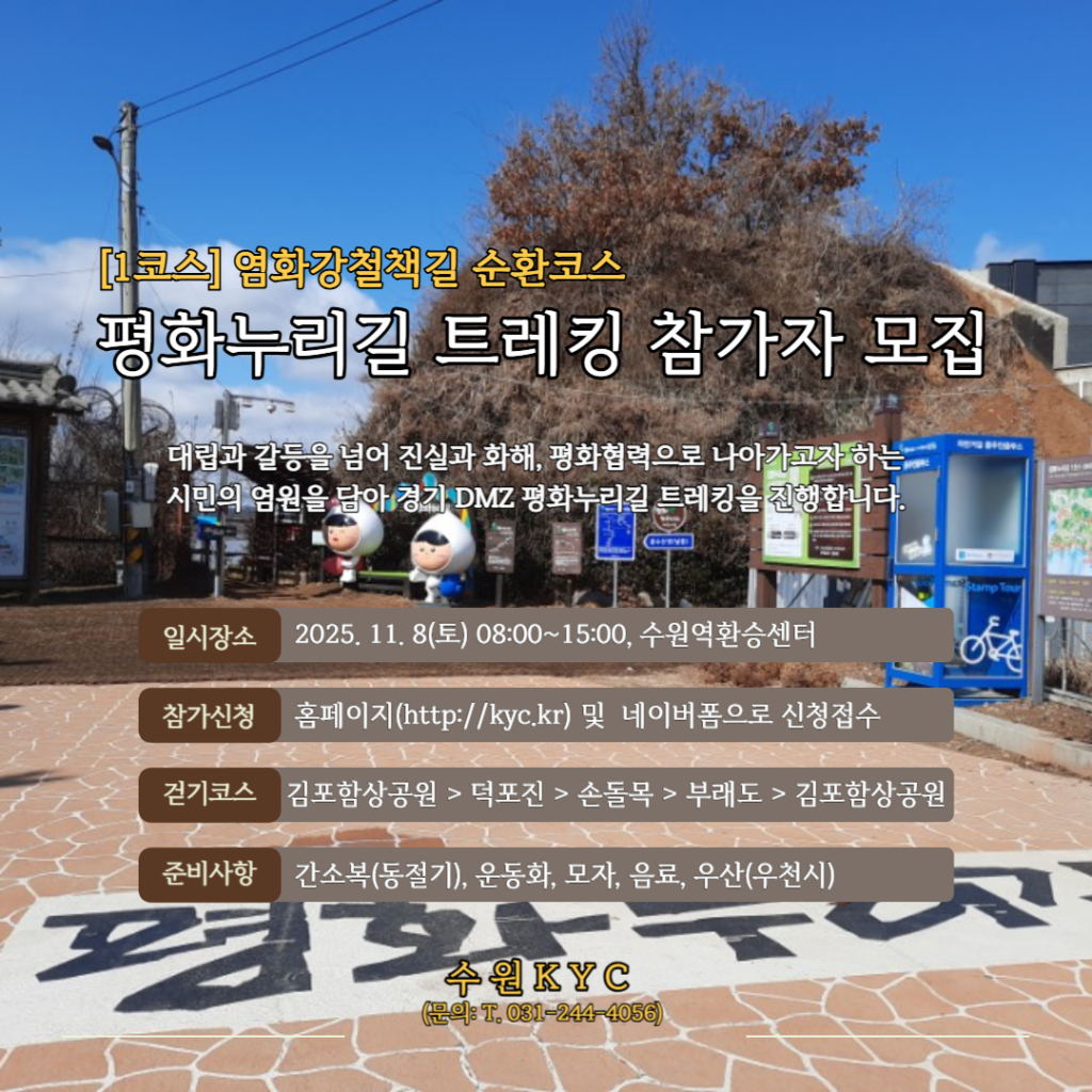 3%충전소 KYC지부 수원KYC 평화누리길 트레킹 참가자 모집 2025년 10월 27일2025년 10월 27일 KYC 0 댓글 평화누리길 1코스(염화강철책길 순환코스)트레킹 참가신청 하세요 2025년 KYC회원과 함께 하는 화성길라잡이 현장탐방의 마지막 탐방코스는 경기도 평화누리길 1코스 염화강 철책길 순환코스입니다.지난 3년간 대립과 갈등으로 점철된 남북한 관계가 화해와 평화, 협력으로 나아가기를 바라는 시민들의 염원을 담아 평화누리길을 함께 걷고자 합니다. 많은 관심과 참여를 바랍니다1. 출발일시: 11월 8일(토) 08:00~15:002. 출발장소: 수원역환승센터3. 소요시간:: 2시간내외4. 걷기코스: 김포함상공원>덕포진>손돌목>부래도>김포함상공원5. 준비사항: 간소복(동절기),운동화,모자,음료,우산(우천시)6. 신청방법: 홈페이지(kyc.kr) 및 네이버폼 신청접수– 신청하기: https://naver.me/GScSvv6i7. 기타문의: 수원KYC(T.031-244-4056) 평화누리길 트레킹 신청하기