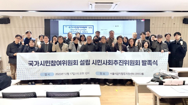 ‘국가시민참여위원회 설립 시민사회추진위원회(이하 추진위)’는 12월 17일(수) 낮 12시, 서울시공익활동지원센터 모이다홀에서 ‘전체 대표자회의 및 발족식’을 개최하고 공식 출범을 알렸다.